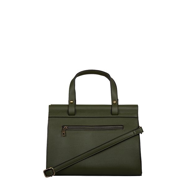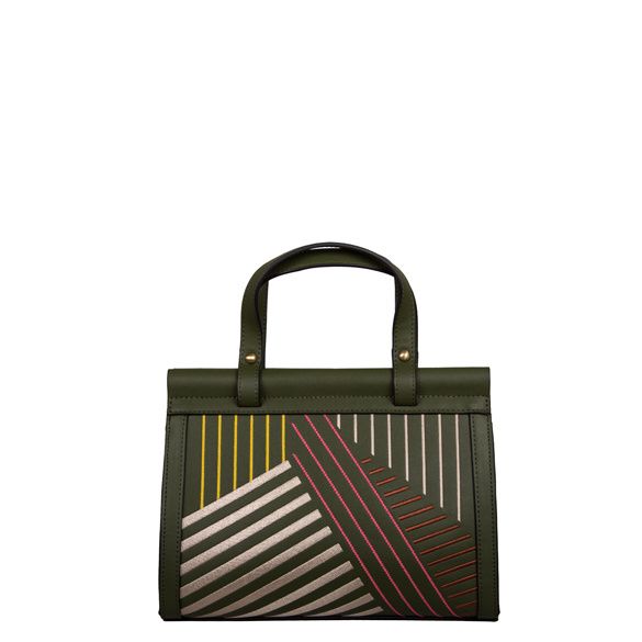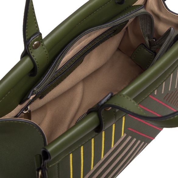 This refreshing khaki green handbag Shelly, is a great addition to your wardrobe this spring and summer season. At the front of the bag is a coloured embroidery in the colours yellow, blue and brown. This handbag has short, double straps and can be worn comfortably in the hand. Thanks to the additional shoulder strap, this bag can be worn over the shoulder too.The bag has a spacious main compartment and two relatively small inner pockets, of which one with a zipper. There is also a zip pocket on the back side of the bag. The bag itself also closes with a zipper. The colour of the hardware is called 'antique brush' and has a messing colour, like polished gold.