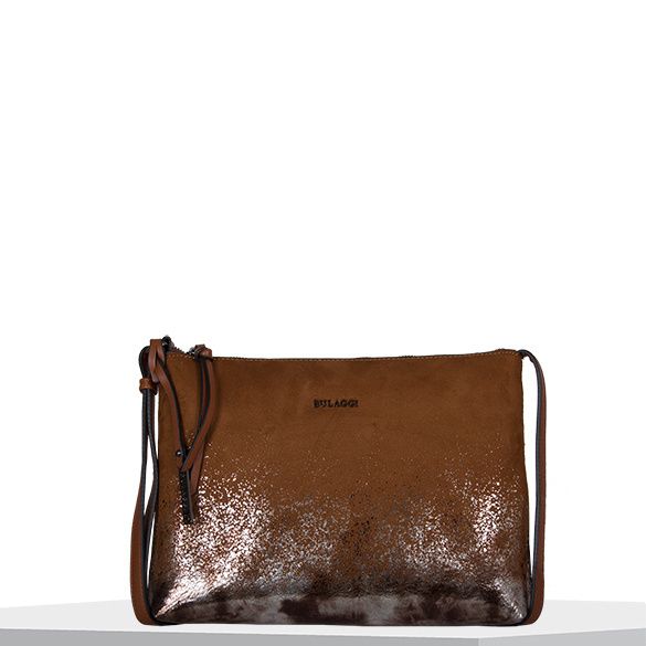This crossbody bag Flame, is a stylish bag with an awesome print. The bag is made of supple imitation suede. At the bottom, a slightly shiny gradient of metallic accents in the colours cognac and silver begins on both sides. This cross body bag has an adjustable shoulder strap, so that you can wear this bag at a perfect height. This bag has a large main compartment and three inner pockets of which one with a zipper. There is also a zip pocket on the back side of the bag. The bag can be closed with a zipper. The colour of the hardware is called 'gun metal' and has a dark anthracite colour.